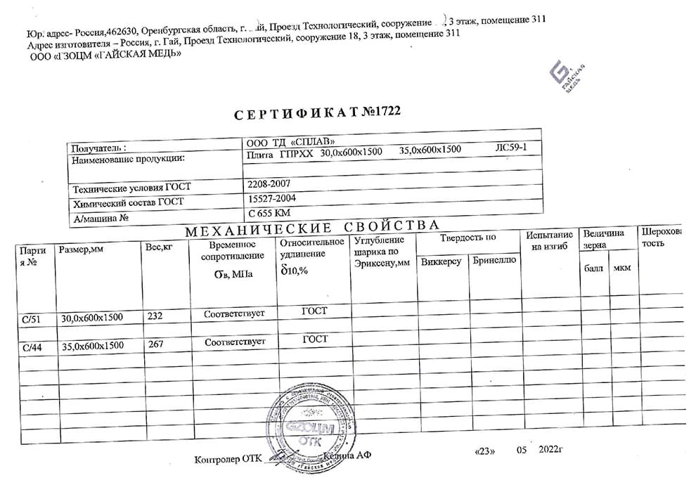 Латунные листы толщиной от 0,4 до 80 мм, марок Л63 и ЛС59-1, по ГОСТ 2208-2007, с химическим составом по ГОСТ 15527-2004, Отбор и подготовка проб сплавов по ГОСТ 24231-80. Точность изготовления листов по толщине, ширине и длине: нормальная, повышенная и высокая. По состоянию материала лист: твердый, полутвердый и мягкий.