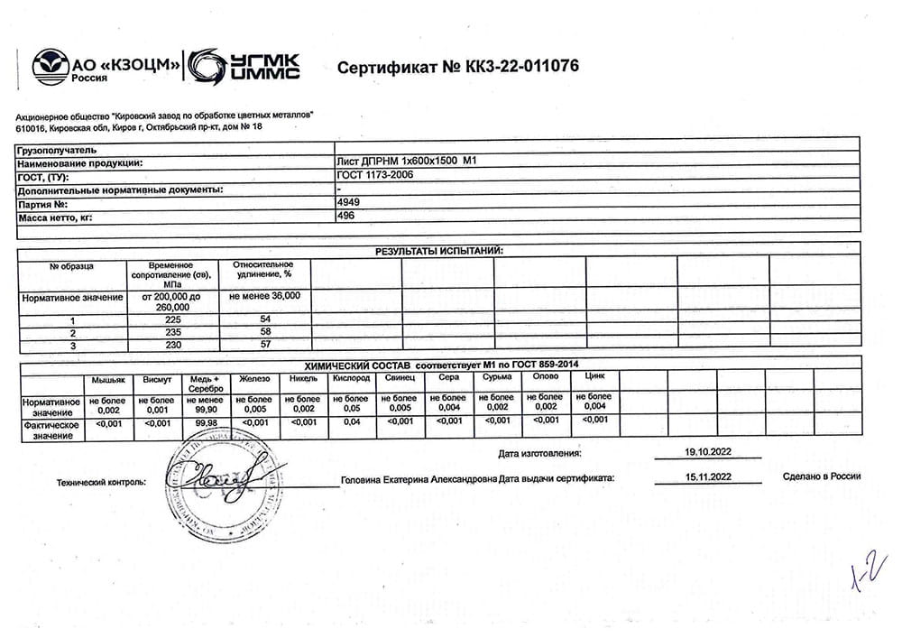 Медные листы по ГОСТ 1173-2006, прямоугольного сечения, различается по чистоте меди, содержанию в сплаве: олова, сурьмы, свинца и никеля. Холоднокатаные и горячекатаные листы с матовой поверхностью, по ГОСТ 495-92, из меди марок М1, М2 и М3 с химическим составом по ГОСТ 859-2001. Отбор и подготовку проб по ГОСТ 24231-80.